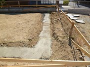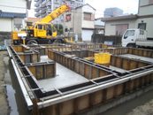 底盤部分のコンクリート打設です。打設前に、基礎の外周に沿って、捨てコンクリートに描かれた芯墨又は遣り方の水糸を基にして型枠を設置していきます。型枠には、木製ものと鋼製のものがありますが、最近は鋼製の型枠の方が多いようです。 |