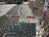 根切り底や土間コンクリート部分に対し、砕石を敷きこむ作業です。この作業で注意が必要なのは、粒度が揃いすぎた砕石は、重機転圧しても締固まりにくいので注意を要することです。大小入り混じった砕石の方が固まり易いのです。 |