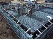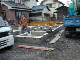 底盤部分のコンクリート打設です。打設前に、基礎の外周に沿って、捨てコンクリートに描かれた芯墨又は遣り方の水糸を基にして型枠を設置していきます。型枠には、木製ものと鋼製のものがありますが、最近は鋼製の型枠の方が多いようです。 |