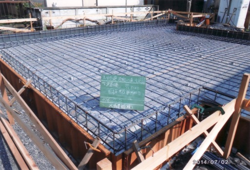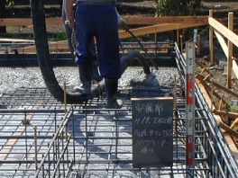 基礎の立ち上がり部分、スラブ部分などを設計図通りに配筋する。鉄筋はJIS品を使用し、さびや変形などがない鉄筋を使用しています。スペーサー(ピンコロ)を用いて、コンクリートのかぶりを確保する方法も大切です。 |