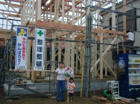 家屋建築で、主要な柱や梁、棟木などを組み上げることですが、基礎コンクリートの固まり具合を見て、建て前を決めます。なお、上棟式は最近では行わないところが多いようです。 |